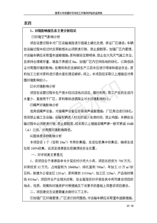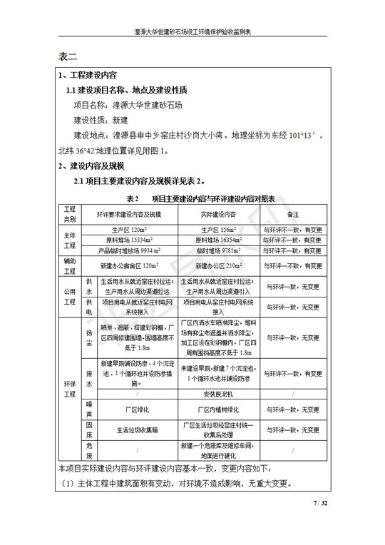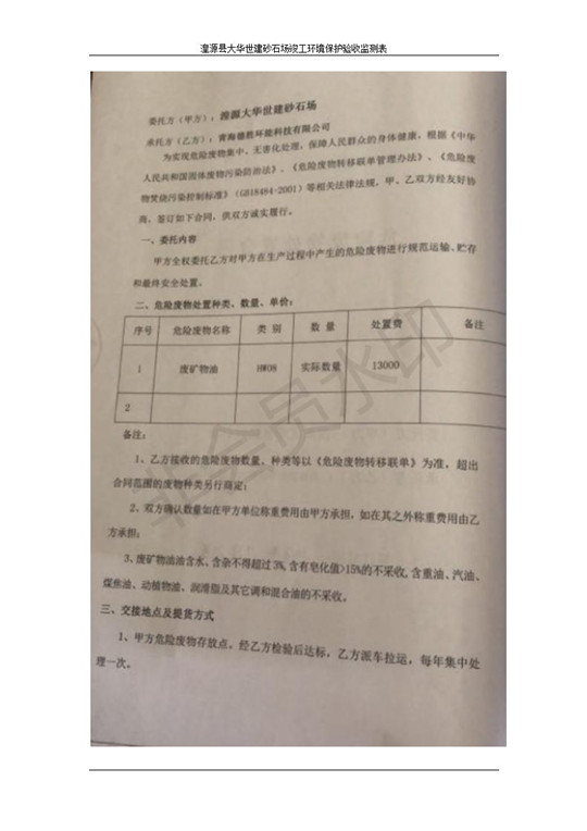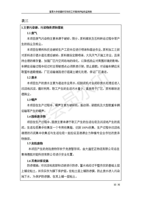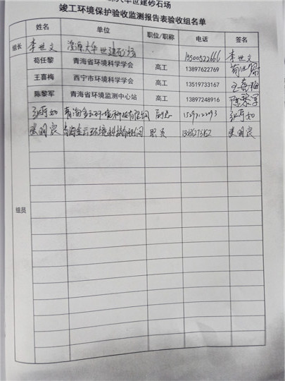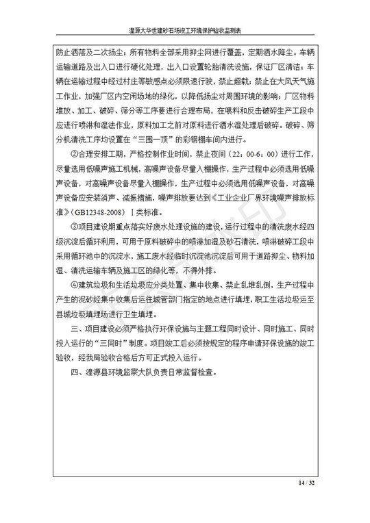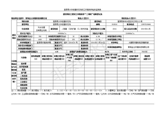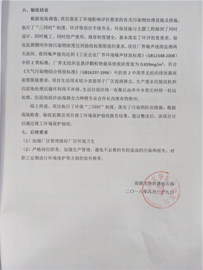 根據(jù)中華人民共和國國務院令第253號《建設項目環(huán)境保護管理條例》(中華人民共和國國務院令第682號《國務院關于修改〈建設項目環(huán)境保護管理條例〉的決定》和《建設項目竣工環(huán)境保護驗收暫行辦法》,嚴格依照有關法律法規(guī),建設項目環(huán)境保護設施驗收技術規(guī)范,本項目環(huán)評報告表和環(huán)保審批部門審批意見以及企業(yè)自行驗收相關要求等對本項目進行驗收,本項目符合環(huán)保驗收條件,可以通過環(huán)保驗收。 湟源大華世建砂石場建設項目竣工環(huán)境保護驗收意見.