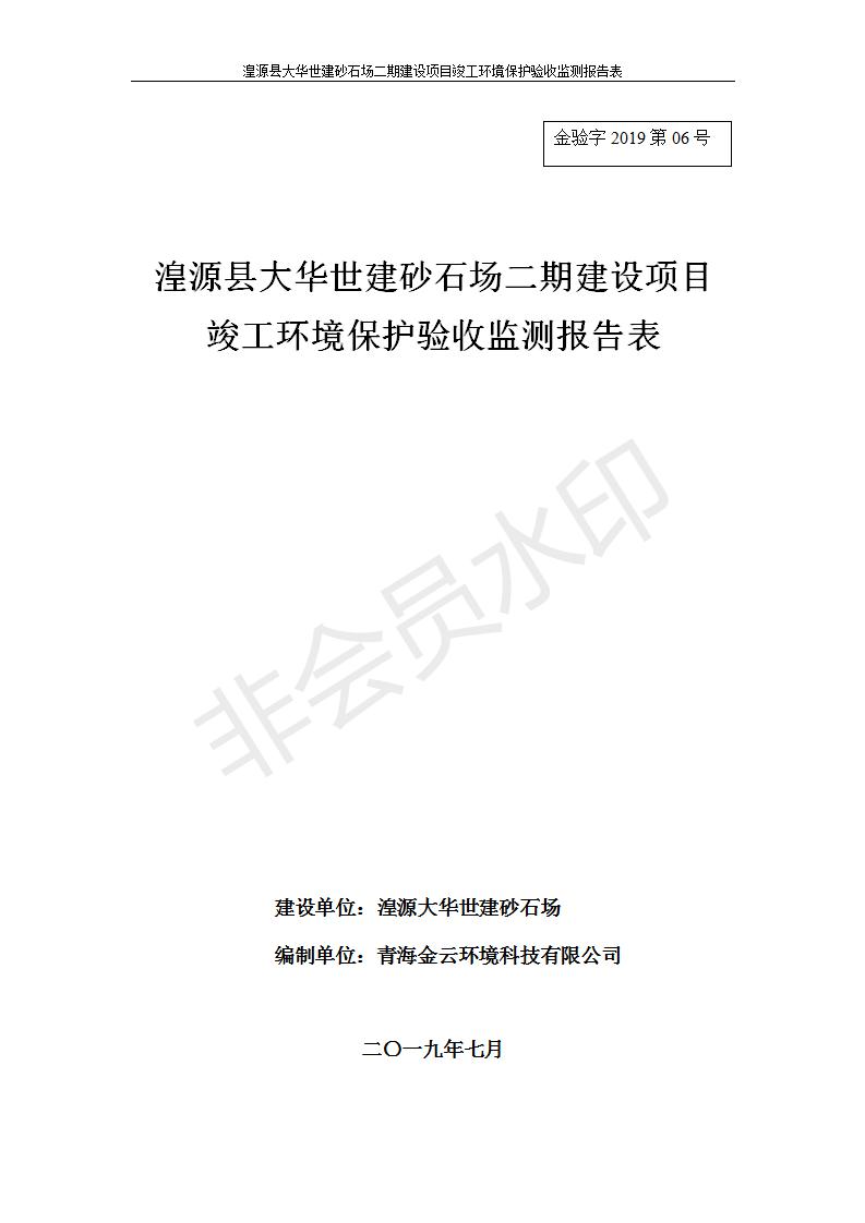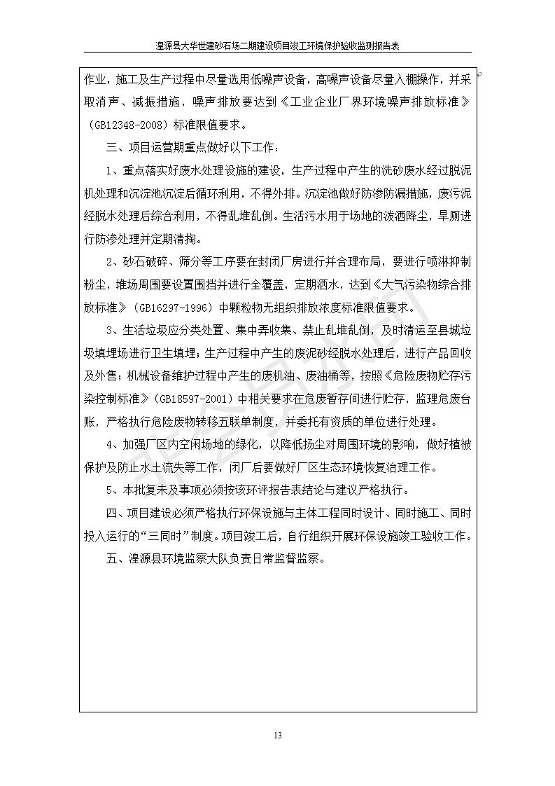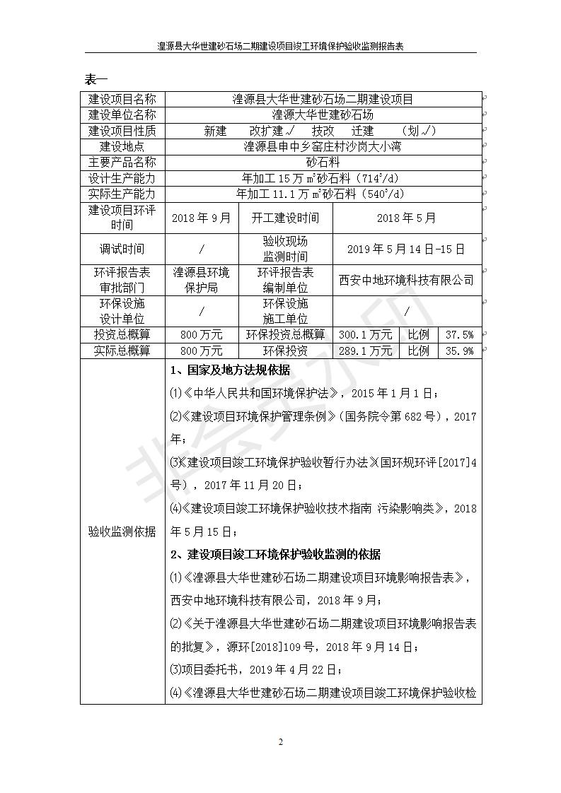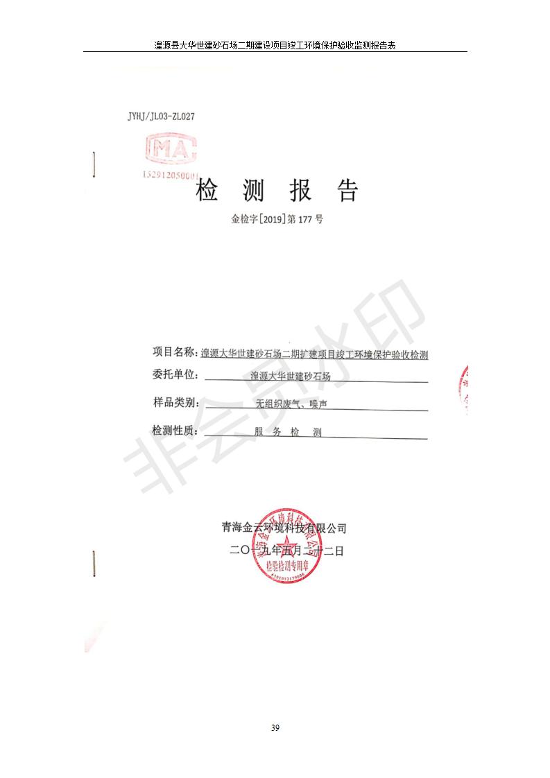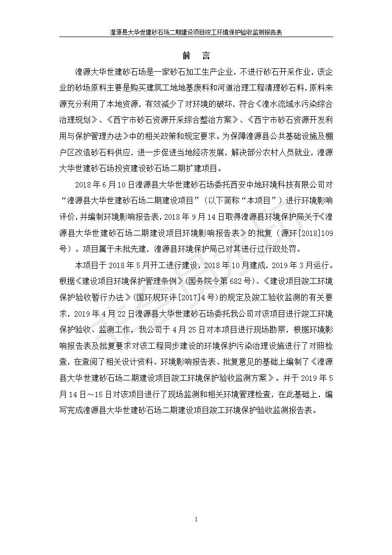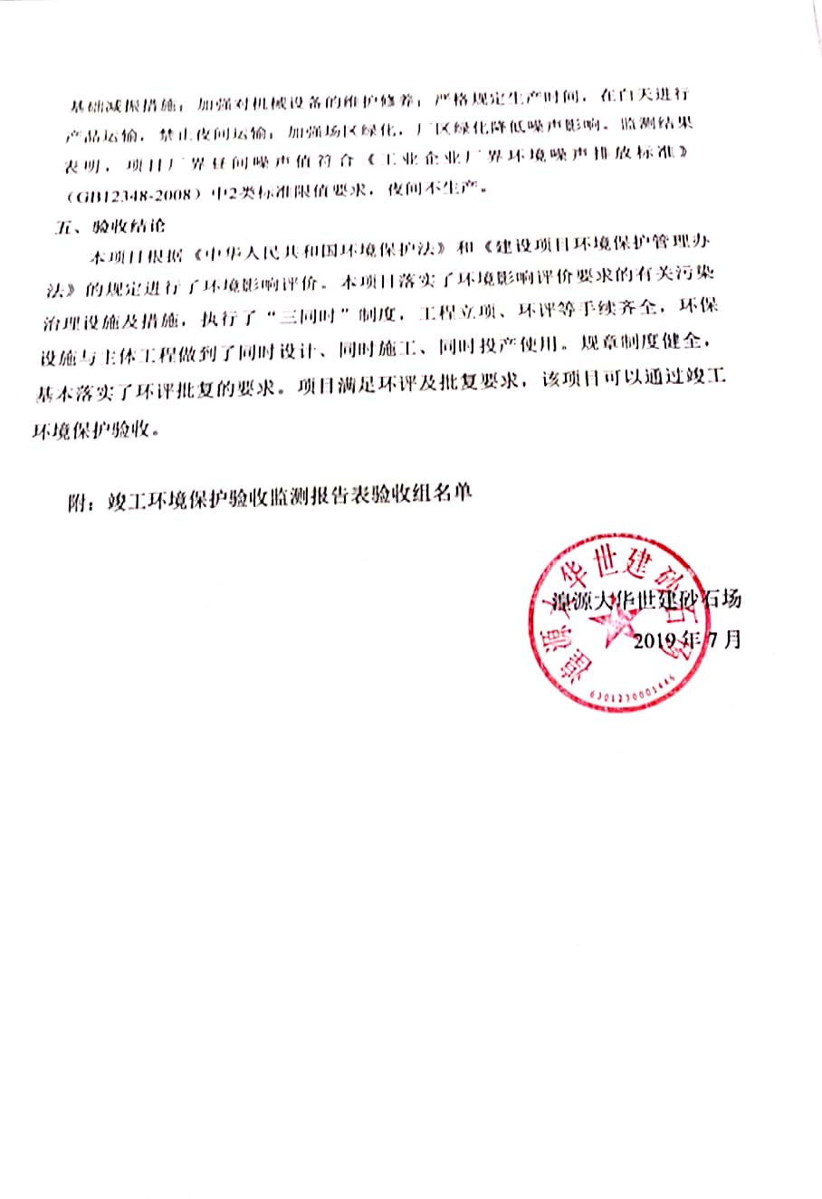 根據(jù)中華人民共和國國務(wù)院令第682號(hào)《國務(wù)院關(guān)于修改〈建設(shè)項(xiàng)目環(huán)境保護(hù)管理?xiàng)l例〉的決定》和《建設(shè)項(xiàng)目竣工環(huán)境保護(hù)驗(yàn)收暫行辦法》(國務(wù)院令682號(hào)),湟源大華世建砂石場(chǎng)湟源縣大華世建砂石場(chǎng)二期建設(shè)項(xiàng)目(包括竣工環(huán)境保護(hù)驗(yàn)收監(jiān)測(cè)報(bào)告表和驗(yàn)收意見)公示如下。 一、項(xiàng)目名稱:湟源縣大華世建砂石場(chǎng)二期建設(shè)項(xiàng)目 二、地點(diǎn):湟源縣申中鄉(xiāng)窯莊村沙崗大小灣 三、建設(shè)單位:湟源大華世建砂石場(chǎng) 四、建設(shè)內(nèi)容:項(xiàng)目主要建設(shè)砂石料產(chǎn)品加工生產(chǎn)區(qū)、原料堆場(chǎng)、產(chǎn)品堆場(chǎng)、辦公區(qū)等。五、聯(lián)系人:張工 六、聯(lián)系電 話:0971-6515411 七、公示時(shí)間:二〇一九年七月二十五日至二〇一九年八月二十一日公示期間,對(duì)上述公示內(nèi)容如有異議,請(qǐng)以書面形式反饋,個(gè)人須署真實(shí)姓名,單位須加蓋公章。
