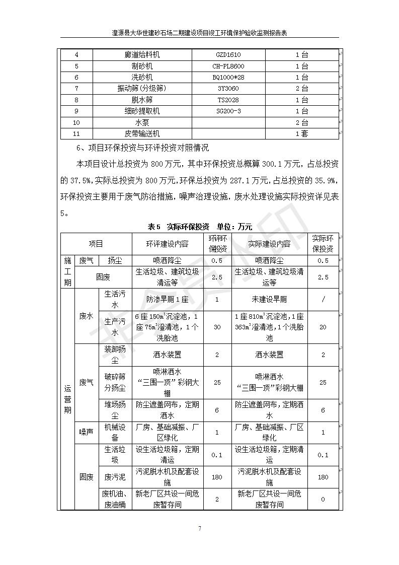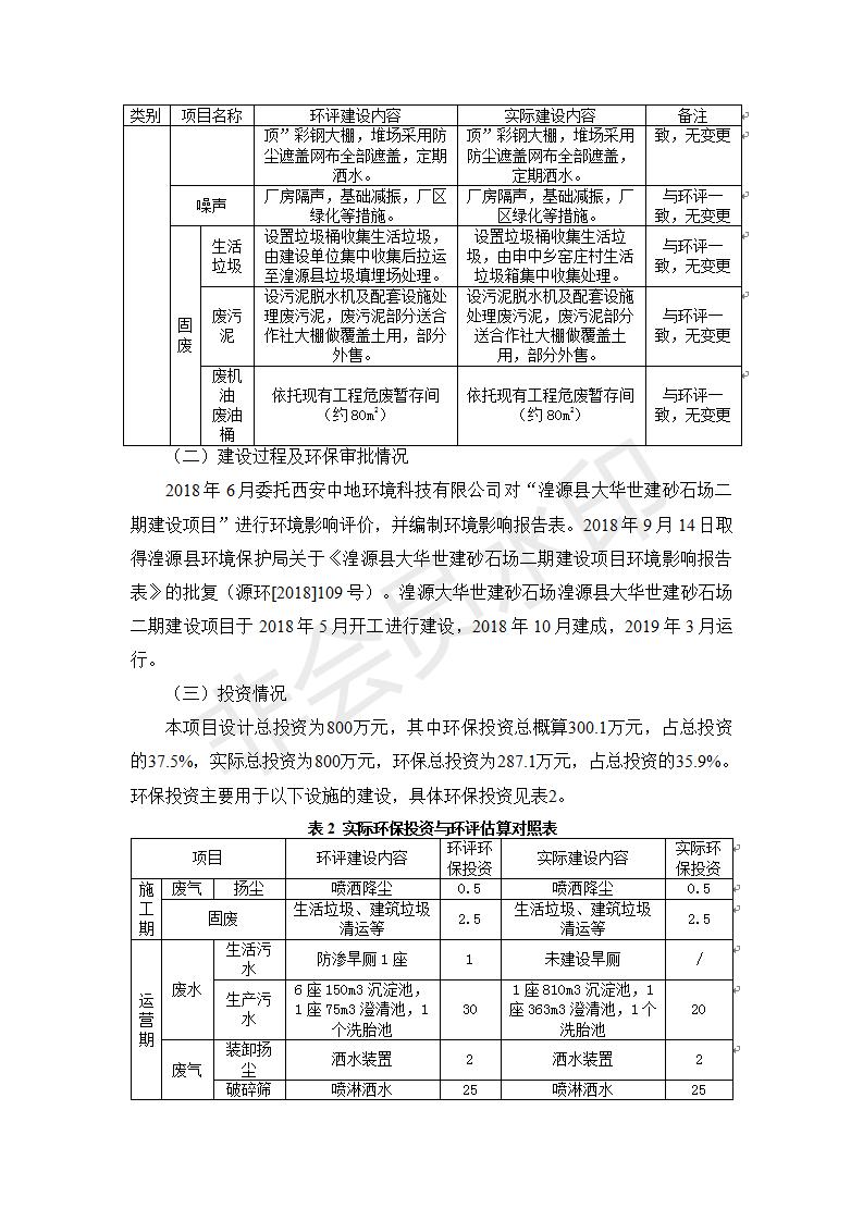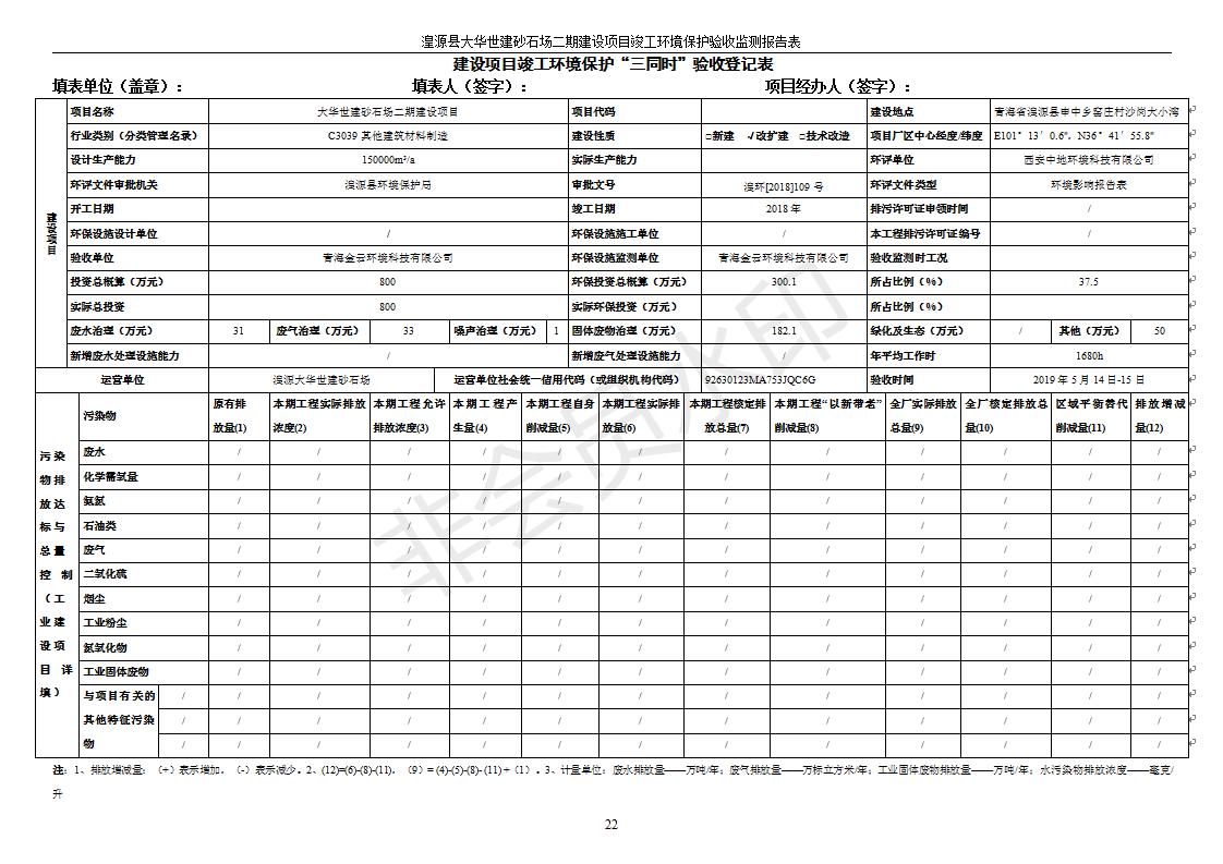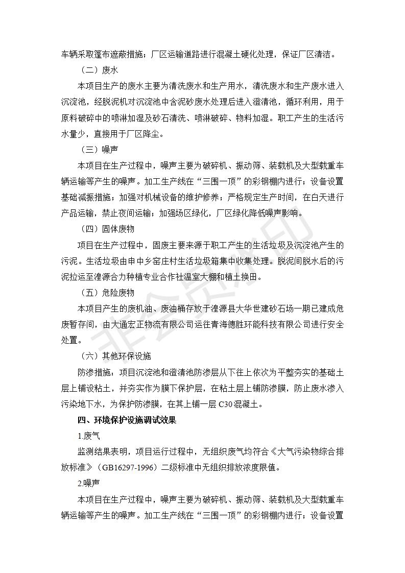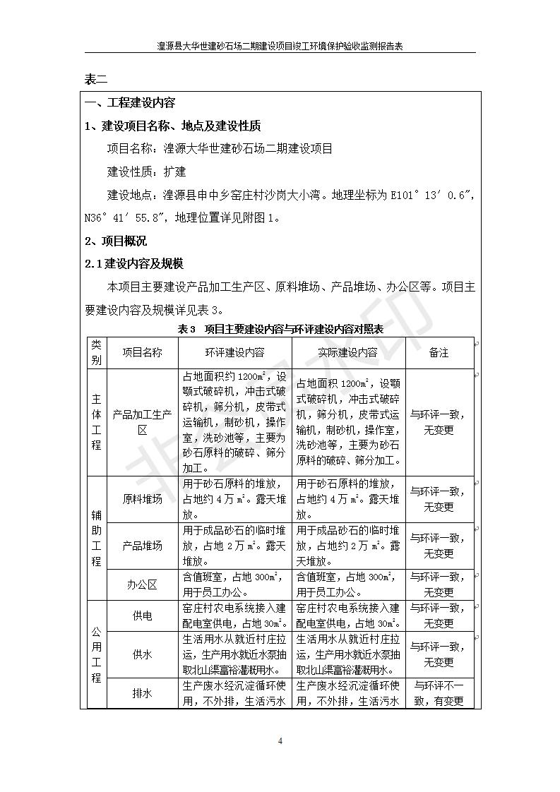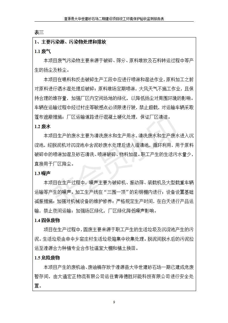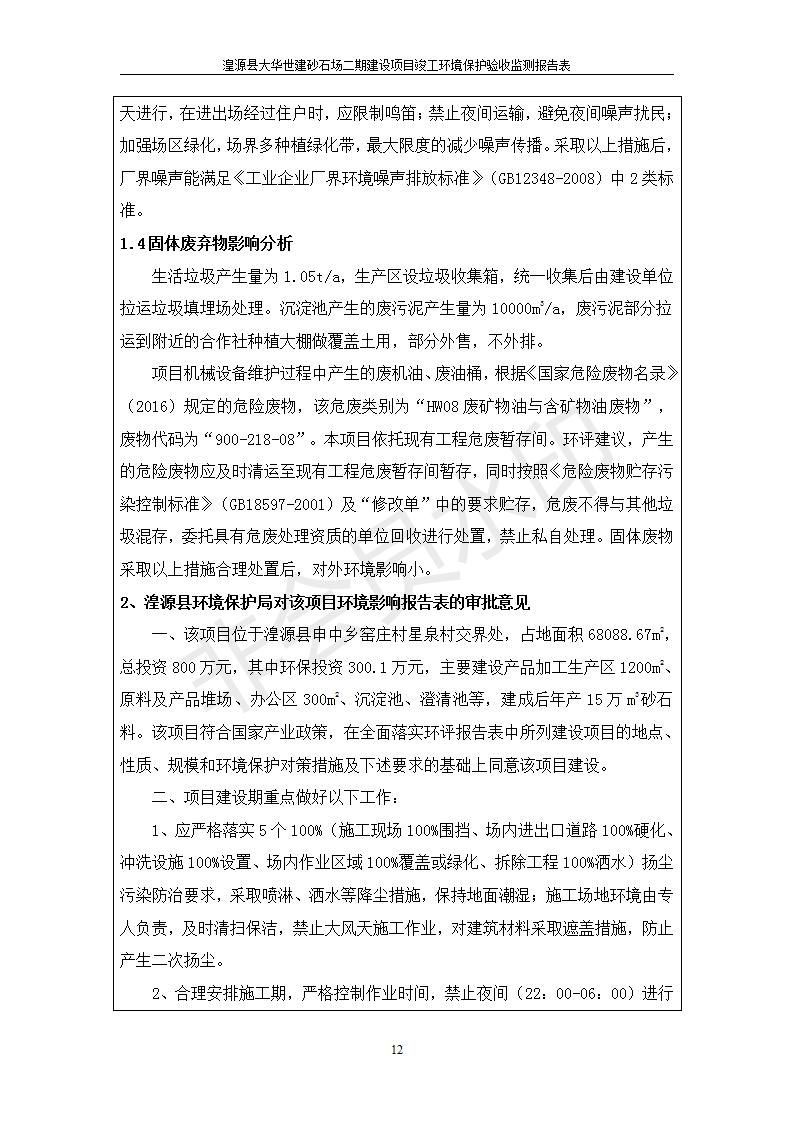 根據(jù)中華人民共和國國務(wù)院令第682號(hào)《國務(wù)院關(guān)于修改〈建設(shè)項(xiàng)目環(huán)境保護(hù)管理?xiàng)l例〉的決定》和《建設(shè)項(xiàng)目竣工環(huán)境保護(hù)驗(yàn)收暫行辦法》(國務(wù)院令682號(hào)),湟源大華世建砂石場(chǎng)湟源縣大華世建砂石場(chǎng)二期建設(shè)項(xiàng)目(包括竣工環(huán)境保護(hù)驗(yàn)收監(jiān)測(cè)報(bào)告表和驗(yàn)收意見)公示如下。 一、項(xiàng)目名稱:湟源縣大華世建砂石場(chǎng)二期建設(shè)項(xiàng)目 二、地點(diǎn):湟源縣申中鄉(xiāng)窯莊村沙崗大小灣 三、建設(shè)單位:湟源大華世建砂石場(chǎng) 四、建設(shè)內(nèi)容:項(xiàng)目主要建設(shè)砂石料產(chǎn)品加工生產(chǎn)區(qū)、原料堆場(chǎng)、產(chǎn)品堆場(chǎng)、辦公區(qū)等。五、聯(lián)系人:張工 六、聯(lián)系電 話:0971-6515411 七、公示時(shí)間:二〇一九年七月二十五日至二〇一九年八月二十一日公示期間,對(duì)上述公示內(nèi)容如有異議,請(qǐng)以書面形式反饋,個(gè)人須署真實(shí)姓名,單位須加蓋公章。