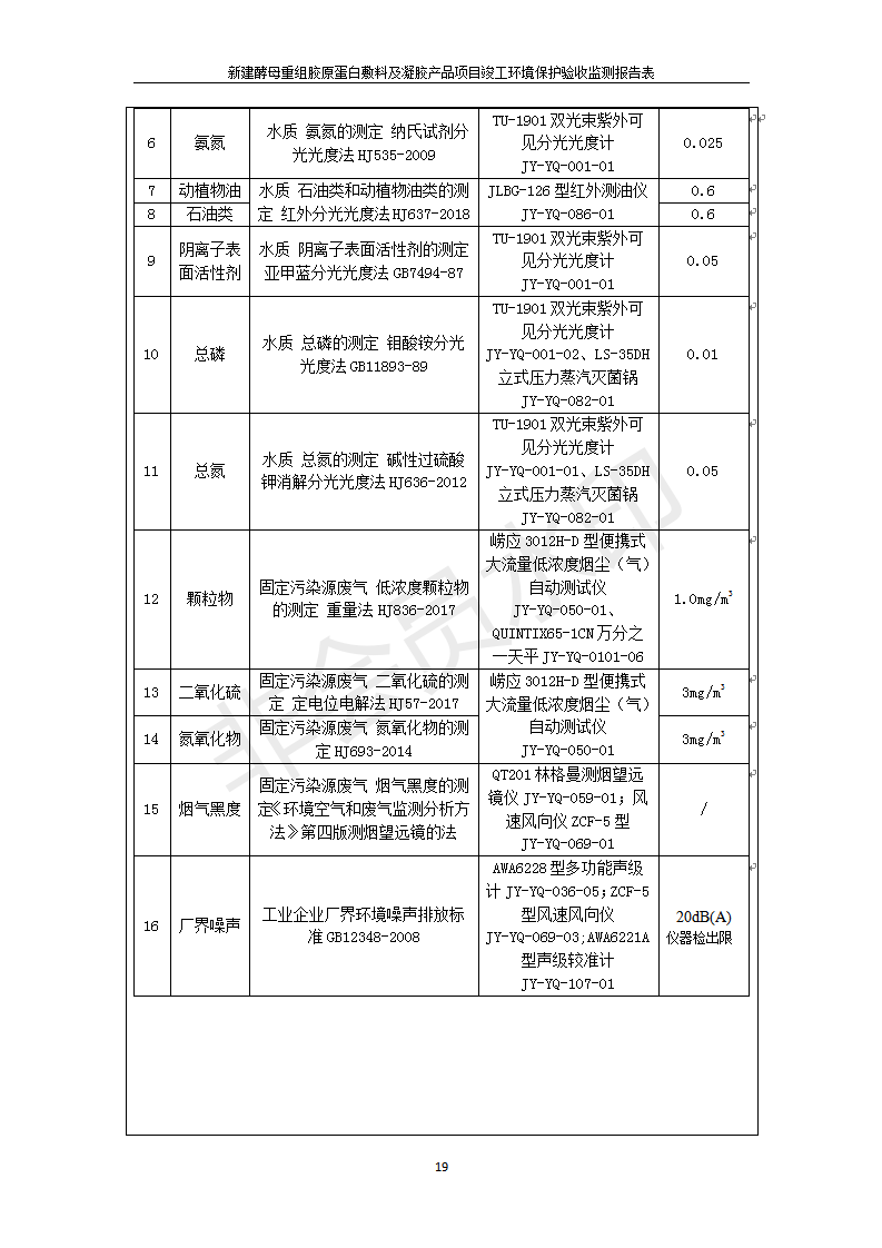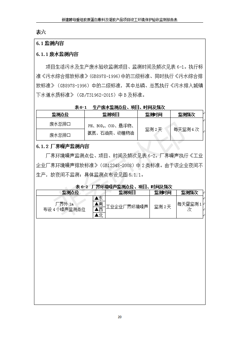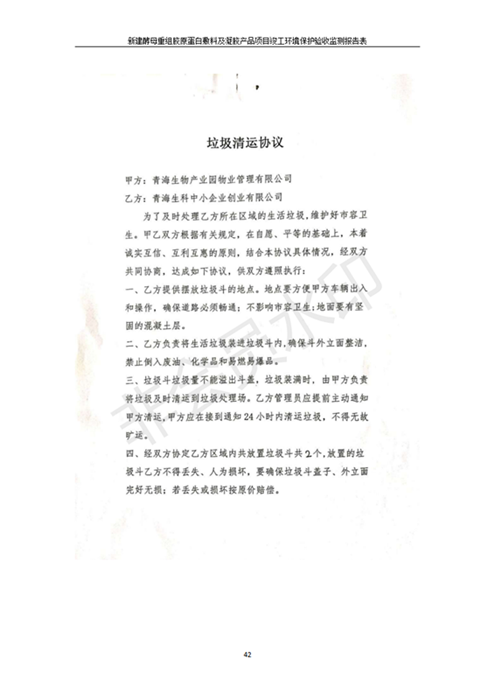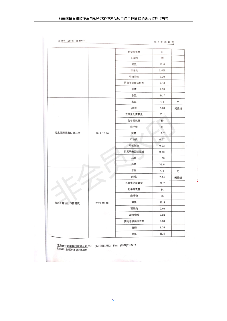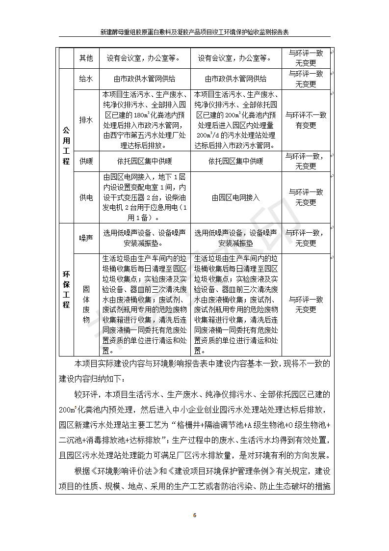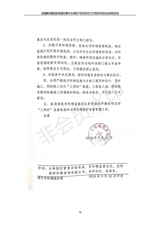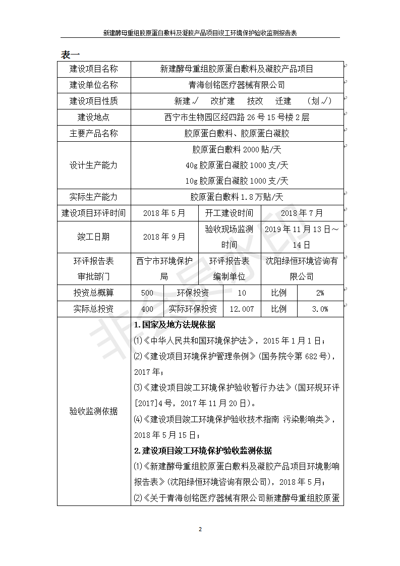 根據(jù)中華人民共和國國務(wù)院令第682號《國務(wù)院關(guān)于修改〈建設(shè)項目環(huán)境保護管理條例〉的決定》和《建設(shè)項目竣工環(huán)境保護驗收暫行辦法》(國務(wù)院令682號),新建酵母重組膠原蛋白敷料及凝膠產(chǎn)品項目(包括竣工環(huán)境保護驗收監(jiān)測報告表和驗收意見)公示如下。 一、項目名稱:新建酵母重組膠原蛋白敷料及凝膠產(chǎn)品項目 二、地點:西寧市生物園區(qū)經(jīng)四路26號15號樓2層 五、聯(lián)系人:董繼風(fēng) 六、聯(lián)系電話:18606125050 七、公示時間:二〇二〇年一月十三日至二〇二〇年二月十二日 公示期間,對上述公示內(nèi)容如有異議,請以書面形式反饋,個人須署真實姓名,單位須加蓋公章。
