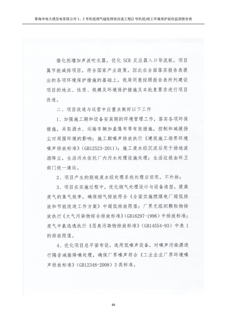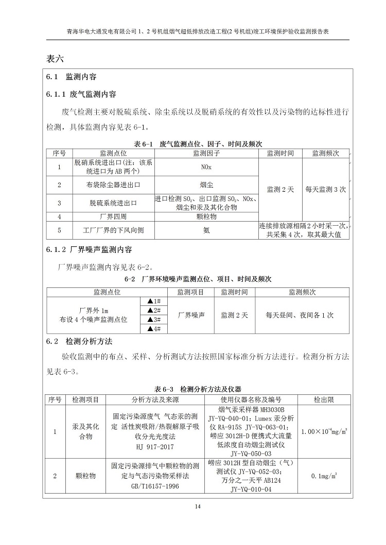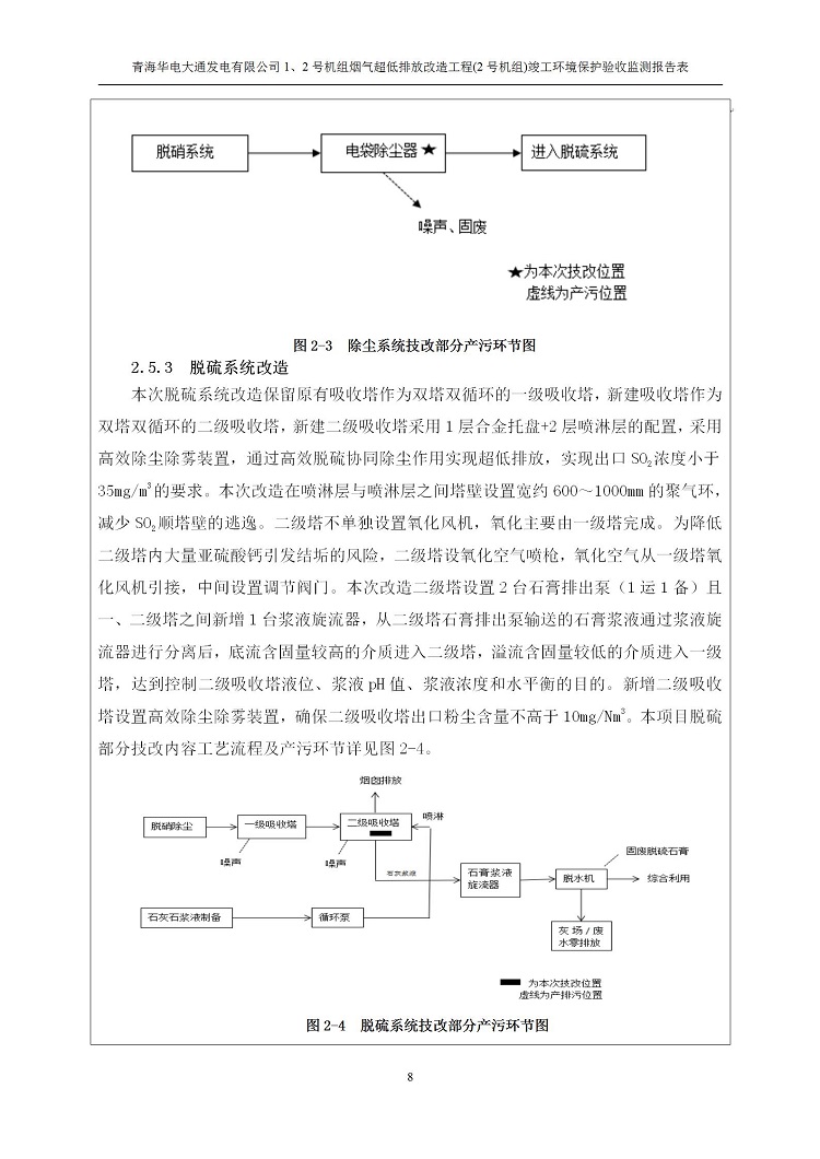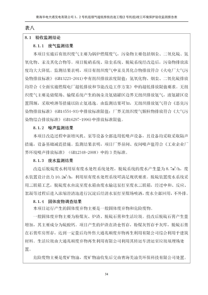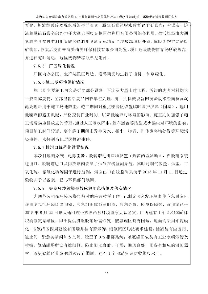 根據(jù)中華人民共和國國務(wù)院令第682號《國務(wù)院關(guān)于修改〈建設(shè)項目環(huán)境保護管理條例〉的決定》和《建設(shè)項目竣工環(huán)境保護驗收暫行辦法》(國務(wù)院令682號),青海華電大通發(fā)電有限公司1、2號機組煙氣超低排放改造工程(2號機組) (包括竣工環(huán)境保護驗收監(jiān)測報告表和驗收意見)公示如下。 一、項目名稱:青海華電大通發(fā)電有限公司1、2號機組煙氣超低排放改造工程(2號機組) 竣工環(huán)境保護驗收監(jiān)測報告表 二、地點:青海省西寧市大通縣寧張公路31公里處 三、建設(shè)單位:青海華電大通發(fā)電有限公司 四、建設(shè)內(nèi)容:2號機組煙氣超低排放改造,2號機組改造內(nèi)容為脫硫系統(tǒng)保留原脫硫裝置作為一級塔,新建二級合金托盤塔串聯(lián)吸收塔;對原“1+2”電袋復(fù)合除塵器的一電場電源進行改造,對布袋除塵器濾袋進行更換;對原脫硝系統(tǒng)選擇性催化還原法(SCR)脫硝工藝加裝備用催化劑,每層催化劑增加聲波吹灰器,優(yōu)化SCR反應(yīng)器入口導(dǎo)流板。 五、聯(lián)系人:馬世敏 六、聯(lián)系電 話:0971-6515411 七、公示時間:二〇二〇年四月二十九日至二〇二〇年五月二十八日 公示期間,對上述公示內(nèi)容如有異議,請以書面形式反饋,個人須署真實姓名,單位須加蓋公章。